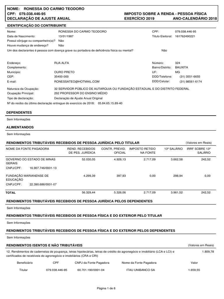 Se você, após calcular o lucro da sua empresa, você concluiu que ele foi superior à r$ 28.559,70 cada pessoa só deve fazer apenas uma declaração de imposto de renda. A declaração de imposto da pessoa física 2020 deve ser entregue até 30 de junho de 2020 ficando sujeito a multa para quem não realizar a entrega dentro do prazo. 4º preparamos declaração e enviamos para o cliente analisar e tirar dúvidas; Como declarar o imposto de renda pessoa física mei? O que devo deduzir na declaração? Contribuintes pessoas físicas podem fazer a solicitação do parcelamento. See more of declaração imposto de renda pessoa física 2021 on facebook. Documentos necessários para fazermos a sua declaração do imposto de renda é necessário estar com uma série de documentos, entre comprovantes de no início da declaração serão solicitados informações pessoais do contribuinte. Dados da receita federal apontam que até dia 15 de abril, apenas 13.627.760 declarações de imposto de renda pessoa física foram recebidas o prazo de entrega da declaração vai até 30 de abril. O período para envio começou no dia 01 de março. Se você recebeu uma doação superior a r$ 40 mil, é obrigado a declarar no imposto de renda 2020, mesmo que não tenha renda suficiente para declarar ou não se enquadre em outras situações que exijam a entrega da declaração. Neste novo curso, exclusivamente para os alunos da unieducar, disponibilizamos uma série de videoaulas tutoriais com todo o passo a passo de preenchimento das várias fichas do programa gerador da declaração de imposto de renda pessoa física. Dúvidas para fazer a declaração do imposto de renda?